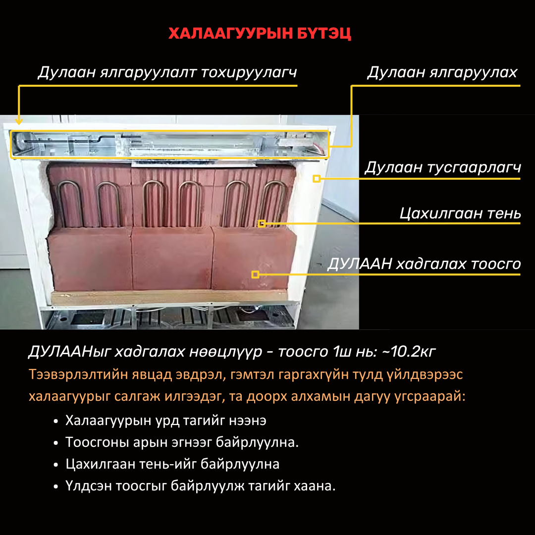 - 3,2кВт чадалтай 175кг халаагуур нь 20-28м² талбайг халаана.