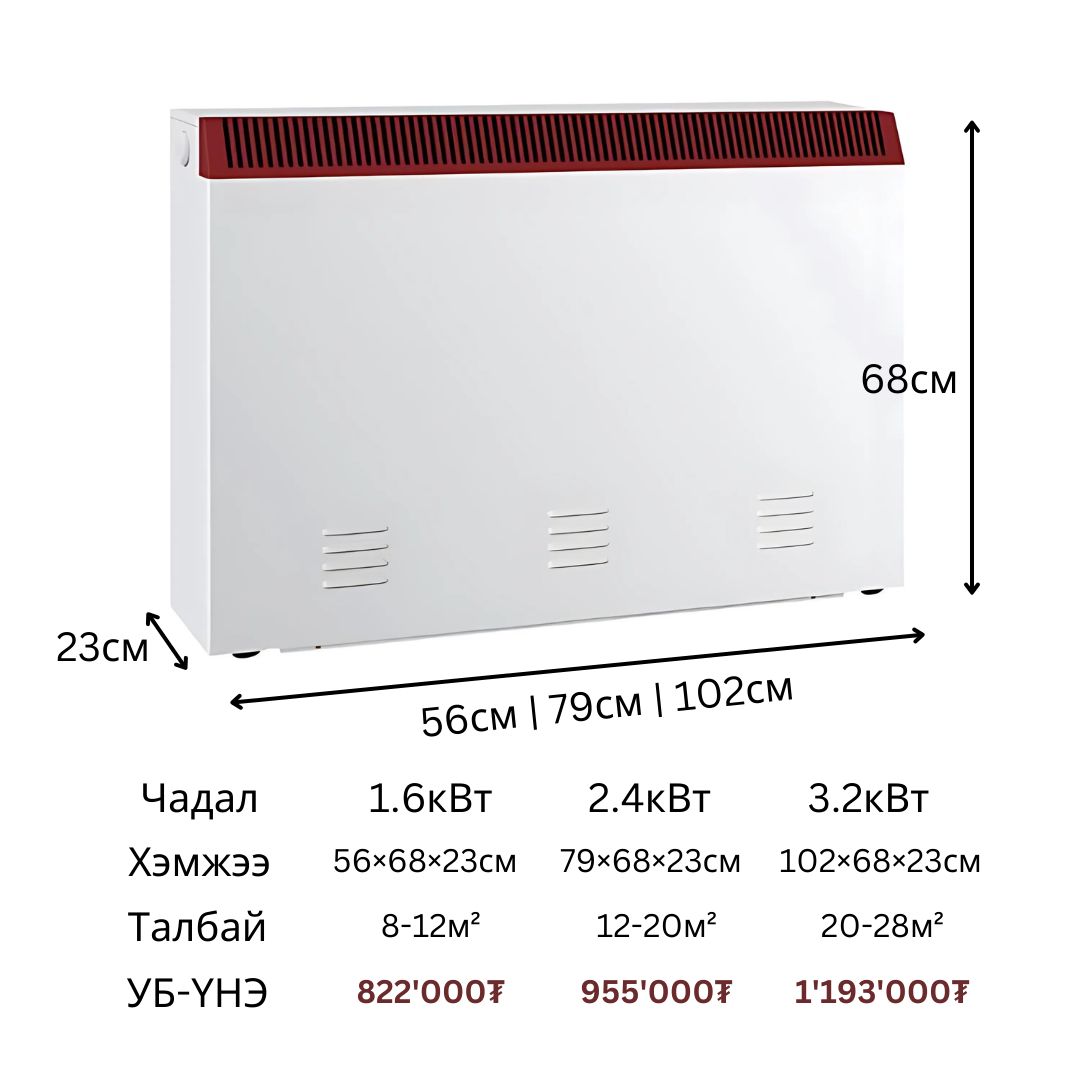 - 1,6кВт чадалтай 90кг халаагуур нь 8-12м² талбайг халаана.
