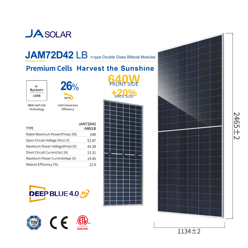 640Вт чадалтай уг модуль нь 22.5–22.9% хүртэл өндөр үр ашигтай, бага гэрлийн нөхцөлд ч тогтвортой ажиллах чадвартай. Мөн bifacial технологийн ачаар ар талаас ойсон гэрлийг ашиглан нэмэлт эрчим хүч үйлдвэрлэх боломжтой бөгөөд системийн нийт гарцыг мэдэгдэхүйц өсгөнө.