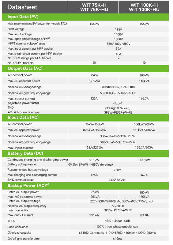 Growatt WIT 100K‑HU нь 100 кВт чадалтай гурван фазын буюу 380В хүчдэлтэй Hybrid инвертер бөгөөд HV – High Voltage 680-100В батерей холбохыг дэмждэг. Grid буюу төвлөрсөн цахилгаан түгээх сүлжээтэй холбогдсон үедээ чадлын хязгаарлалтгүй. Харин цахилгаан тасарсан үед 100кВт хүртэл чадал хангах хүчин чадалтай. Төвлөрсөн цахилгаан түгээх сүлжээнд илүүдэл эрчим хүчээ нийлүүлэх EXPORT хийх функцтэй. параллель холбож, системийг өргөтгөх боломжтой .