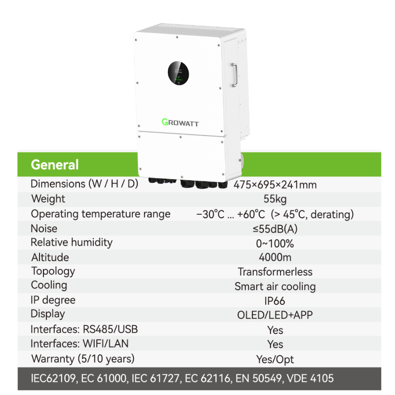 нь 25 кВт чадалтай гурван фазын буюу 380В хүчдэлтэй Hybrid инвертер бөгөөд LV – Low Voltage 51,2В батерей холбохыг дэмждэг. Grid