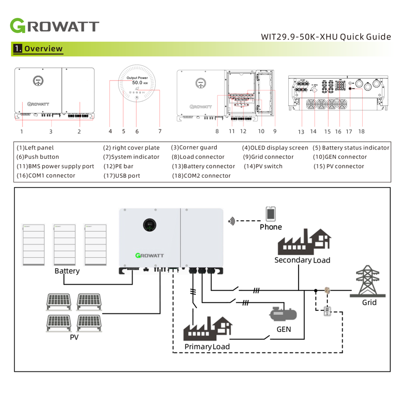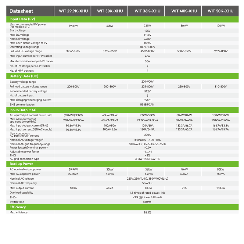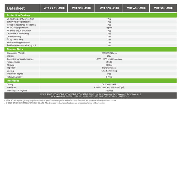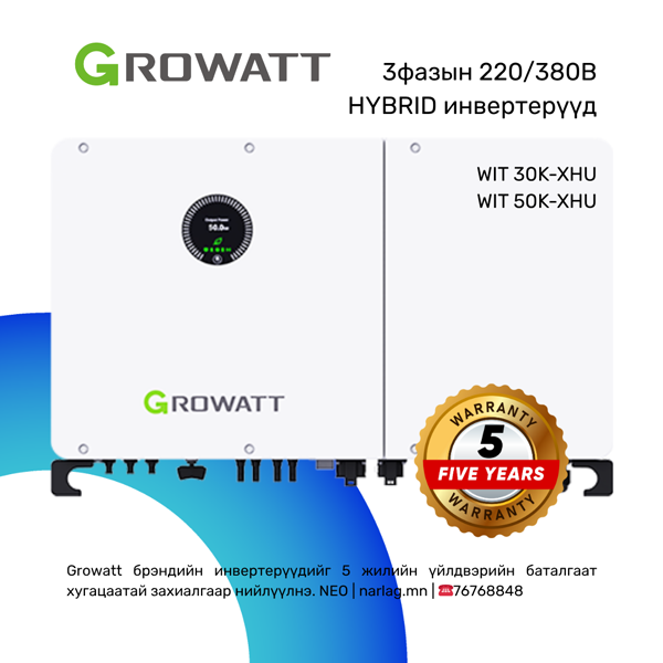 Growatt WIT 30‑50K‑XHU нь өндөр үр ашиг, хүчирхэг хамгаалалт, ухаалаг автомат ажиллагаа бүхий аж ахуйн болон үйлчилгээний зориулалттай иж бүрэн гибрид инвертер юм. Цахилгаан тасралтгүй байдлыг шаардсан төслүүдэд (үйлдвэр, агуулах, жижиг сүлжээ гэх мэт) CRITICAL нөхцөлд ч найдвартай шийдэл болдог.