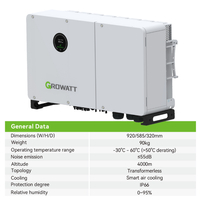 Growatt WIT 50K‑XHU нь 50 кВт чадалтай гурван фазын буюу 380В хүчдэлтэй Hybrid инвертер бөгөөд HV – High Voltage 200-900В батерей холбохыг дэмждэг. Grid буюу төвлөрсөн цахилгаан түгээх сүлжээтэй холбогдсон үедээ чадлын хязгаарлалтгүй. Харин цахилгаан тасарсан үед 50кВт хүртэл чадал хангах хүчин чадалтай. Төвлөрсөн цахилгаан түгээх сүлжээнд илүүдэл эрчим хүчээ нийлүүлэх EXPORT хийх функцтэй. параллель холбож, системийг өргөтгөх боломжтой .